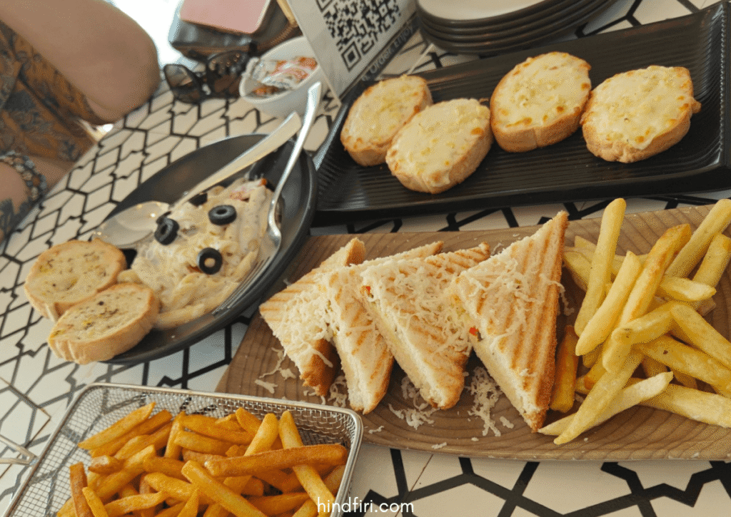 We ordered the cheese garlic bread, white sauce pasta, a side of Peri-Peri French fries, and a veg grilled sandwich.